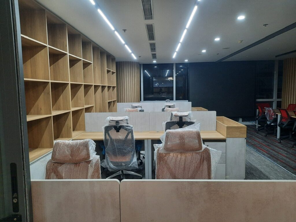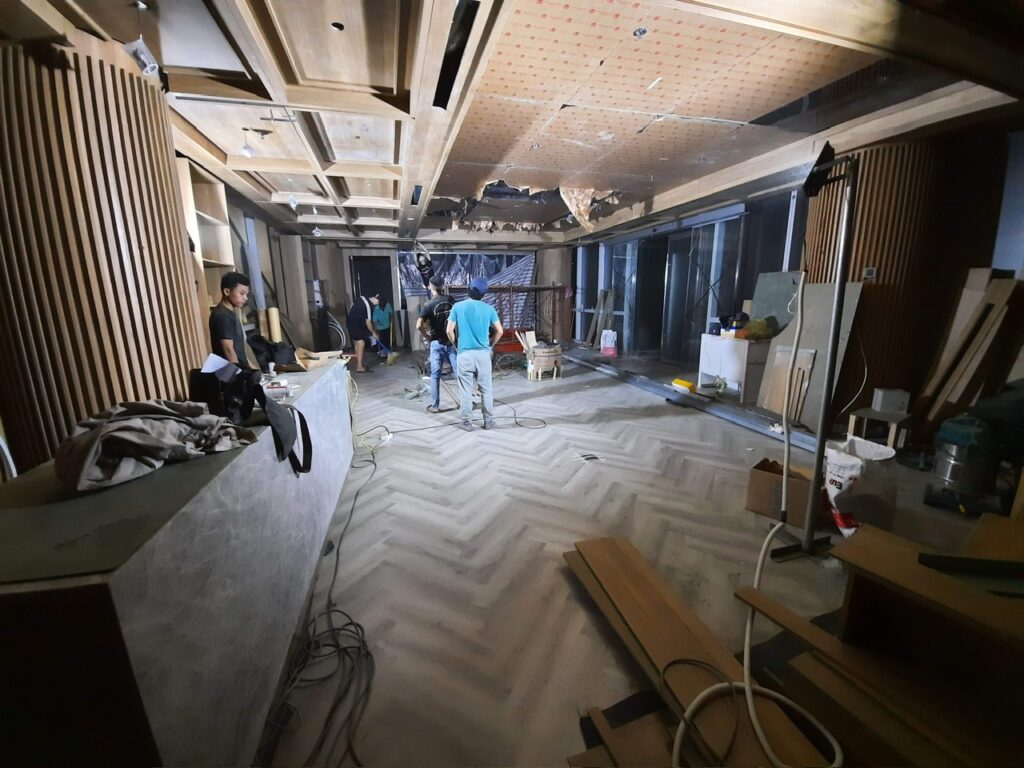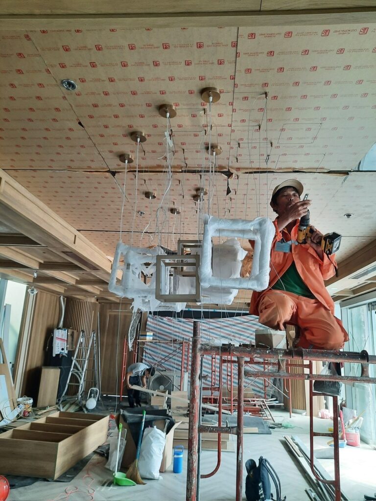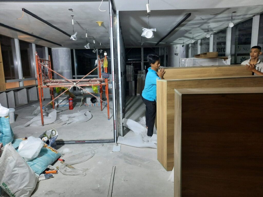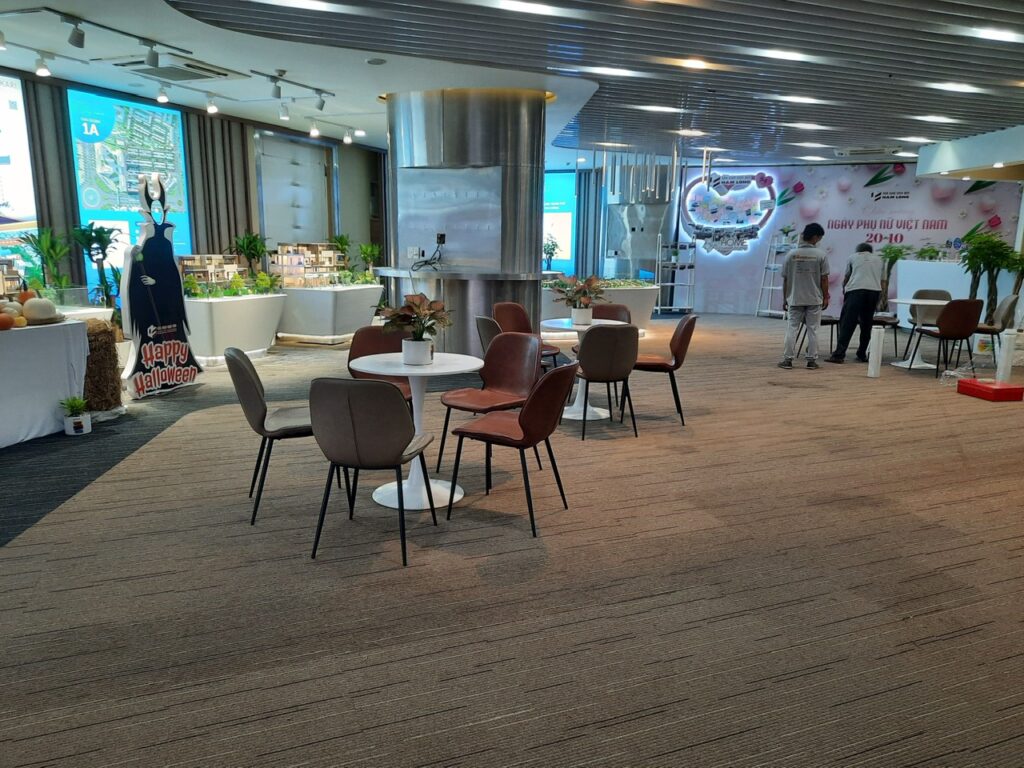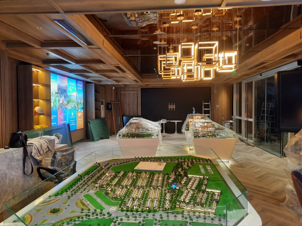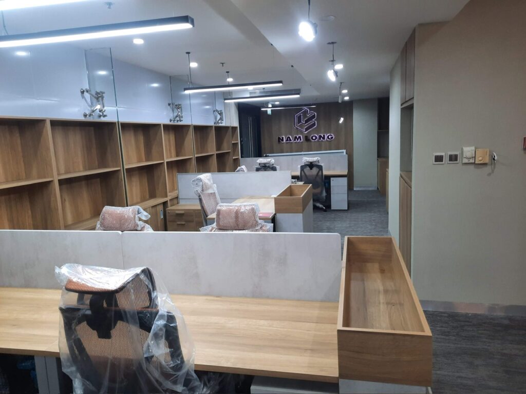 Công trình quận 1 – Tập đoàn bất đọng sản Nam Long. Hạng mục nội thất showrom: Nội thất bàn ghế, vách, lam, trần ốp. Thời gian hoàn thành 60ngày.