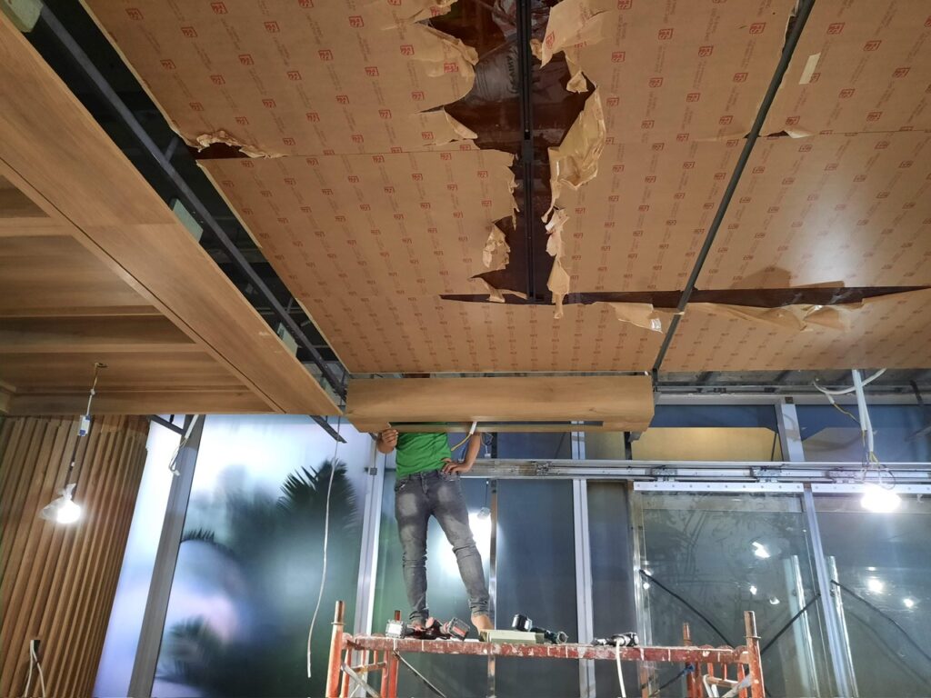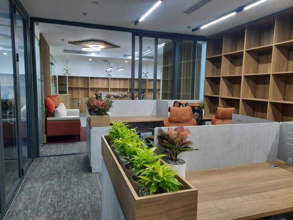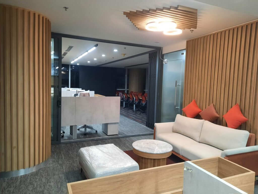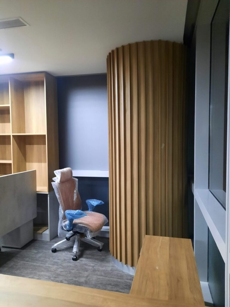 Hạng mục nội thất showrom: Nội thất bàn ghế, vách, lam, trần ốp.